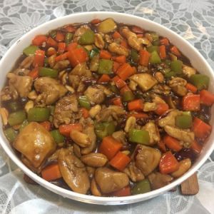 倒入鸡丁翻炒,加入胡萝卜翻炒,加入调好的酱汁,翻炒一会儿,加入黄瓜,翻炒至汁水快收干,加入花生米,稍微炒一下,装盘即可
