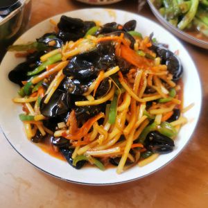根据食材是否容易熟,依次放入,每次放入一种后都要翻炒一会再放入另一种,顺序:笋丝、白糖、料酒(白酒)、木耳、胡萝卜丝、青椒丝,最后混入肉丝,放些淀粉水勾芡,使汤汁变浓一点,能使汤汁附着在食材表面,口感浓郁