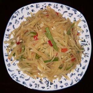 然后下入土豆丝,翻炒均匀加入白醋,再加入盐,鸡精,白糖