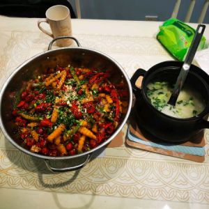 炒料加入蒜蓉、香料、八角、干辣椒等不停翻炒
