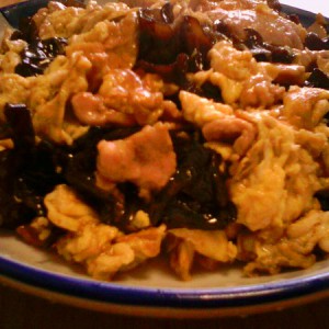 炒锅在次上火,加油烧热,加入葱、姜、蒜爆香,放入肉片加入料酒、生抽、炒匀后加入木耳和鸡蛋同炒加入糖、盐、味精成熟后加入少量湿淀粉收汁。淋入少许香油装盘即可