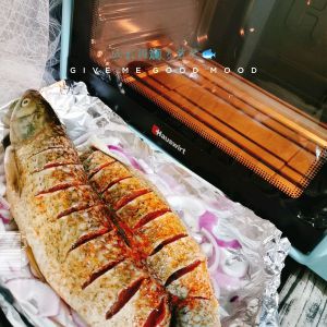 6.给鱼翻面,再烤20-25分钟,铺上炒好的料,淋上汤汁,撒一圈葱花,继续烤10-15分钟