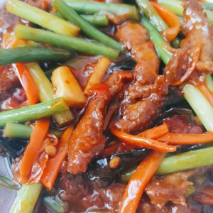 油烧热后关火,等油凉一些后,倒入肉丝快速搅拌。搅开肉丝后开大火翻炒。大约炒2分钟之后关火,盛出肉丝。