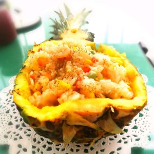 炒肉,青菜 米饭 ,加入各种调料,装入菠萝皮中