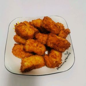 牛奶块先裹淀粉,再裹蛋液,最后裹面包糠