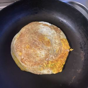 早晨打个蛋放锅里,拿一片饼盖住蛋,不用放。一会就成了一体,葱油蛋饼