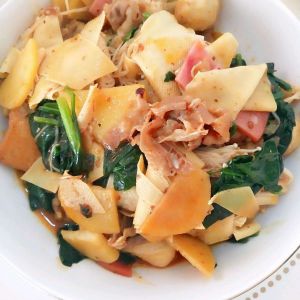 火腿切片备用,葱姜切好备用