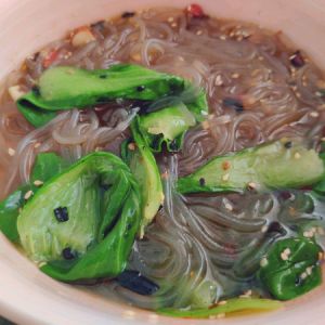 清水入锅,放入粉条,煮至熟透后捞出放碗中备用,油菜入锅烫熟后放入碗中,放两勺热水入碗,然后再根据自己的口感浇入适量调制好的辣椒油