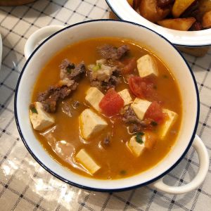锅内放适量油,将番茄炒至出汁后倒入一碗清水大火约五分钟,倒入老豆腐煮沸。
