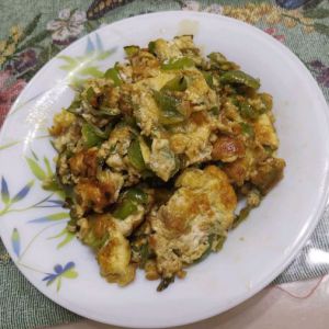 空锅倒入青椒碎,干炒到表面颜色发黄绿色,半熟的样子