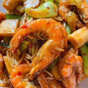 凉油放入麻辣香锅料煸香煸炒出红油,把刚才的蔬菜跟粉条放入锅中翻炒一下就可以开吃了