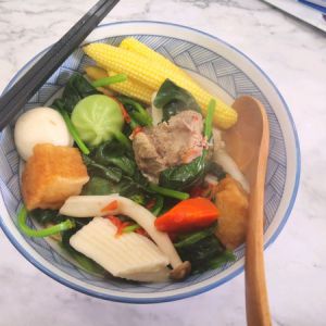 这个时候汤差不多已经好了,加入盐调味,然后把鱼排和各种丸子煮在里面,菠菜烫两秒钟,捞起,鲜到爆炸的番茄排骨汤寄做好啦