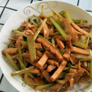 准备食材清洗干净,拍蒜沫,香干切小条,瘦肉切小条,芹菜切小段。