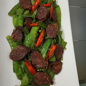 第二步:把切好的香肠,洗好的荷兰豆装盘备用。