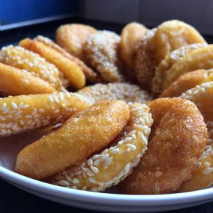 中间沾芝麻和油炸的过程忘记拍照了(o^^o),将糯米团搓圆按瘪再沾上芝麻,锅中放油,大概有平时炒菜油的六倍左右,加热至六成,开小火把沾好芝麻的南瓜饼一个一个放入锅中,一次不要放太多哦,我一锅炸六、七个左右,用铲子不停按压并翻动,直至两面金黄,捞出沥油装盘就可以啦,油炸过的油继续拿来炒菜,不要浪费哦,虽然知道反复油炸的油不好