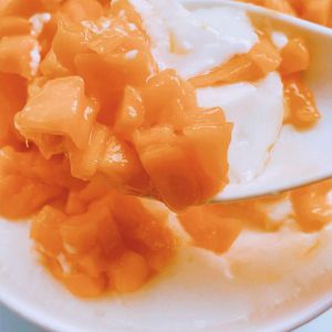 时间到!出锅了,放置常温撒上芒果,开吃啦!夏天可以冰镇后食用口感更美味。