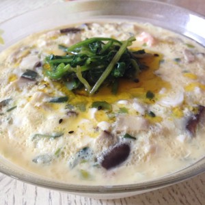 把混合好的蛋液倒入盛放内酯豆腐的容器中,上锅蒸就可以了!出锅后淋上香油,开吃吧!