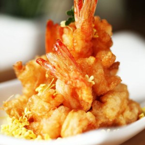 4、 将挂好浆的虾轻轻放入油锅中炸约2分钟待表面变成金黄色即可。