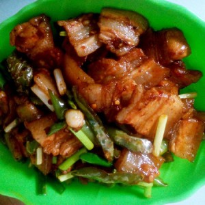 把锅里放入少许油把姜蒜爆香,把焯好的五花肉放进锅里把油编炒出来,把多余的油盛出来,然后放入少许盐,杭椒,豆瓣酱和酱油翻炒几下
