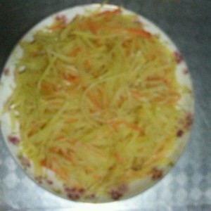 土豆切丝,用清水洗二遍,胡萝卜切丝。