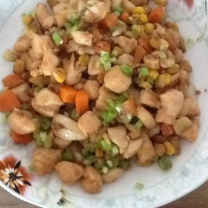 之后放入鸡丁,加一点水淀粉勾芡,加点盐、鸡精、我家喜欢鲜贝露,我就加了一勺