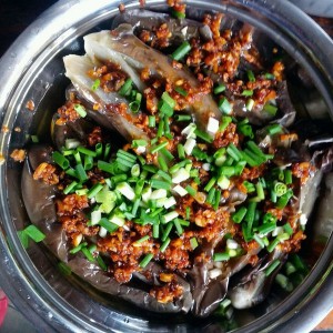 茄子洗净后入锅,拿清水煮25分钟。期间切蒜米,肉末以及葱圈。