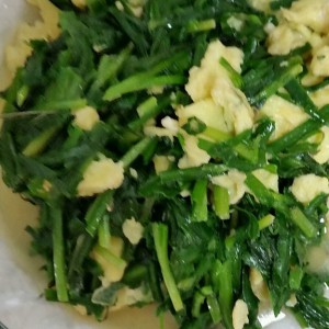 蛋熟,注意翻面,蛋成形后放置炒熟的韭菜翻炒,最后装盘
