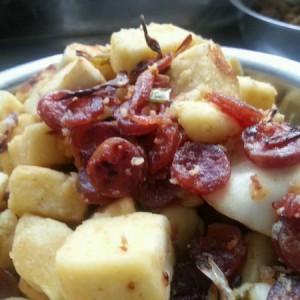 腊肠呈半透明状,且明显感觉出油后,倒入拌好的馒头丁,继续翻炒。