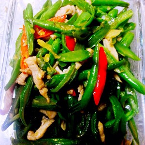 放肉丝,放盐,迅速炒,肉儿变色把四季豆倒入!