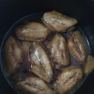 锅底撒油,放入姜片,鸡翅放于姜片之上,倒入酱汁,开始烹饪