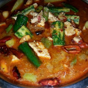 锅里再次倒入油,九分热的时候放入姜丝、大蒜、尖椒、干辣椒、火锅底料、豆瓣酱一起炒出香味!然后加入适量的清水,白糖,酱油,料酒!水开了之后放入青瓜和肉片!