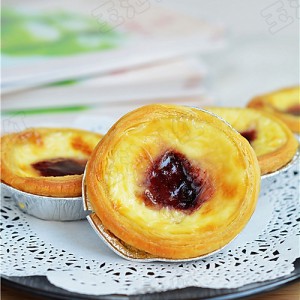 从烤箱中取出来,每个蛋挞中放入蓝莓酱一小勺。