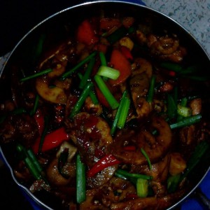 为了炒制的过程加快,所以我把素菜都焯水了,这里有第一次做的时候焯水过的素菜图,焯水后的菜捞起,水不要泼,开火继续,鸡肉焯水,大概5分钟,这样鸡肉的油沫都出来了,
