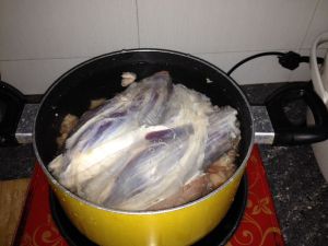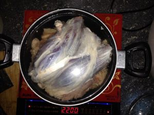 大火煮沸转小火慢炖。大概两个小时。时间有点长,但美味是需要等待的。用筷子插入肉里,肉从筷子里滑落下来说明已经熟了,捞出来沥干晾凉。