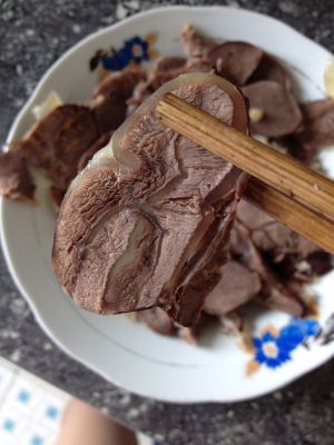 切片装盘。晾凉的肉切片,撒上盐和花椒就这么吃,配上一碗清汤,感觉棒棒哒。也可以切薄下面下粉或煮火锅。白色的那个就是筋,筋肉相间,很好吃哦!