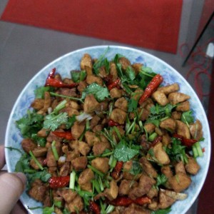 盛起,锅里还有少量油,放入葱姜蒜,干辣椒炸香,倒入炒好的鸡肉,放盐,拌均匀。加酱油上色,此时可以放一点点水,继续炒一会儿,出锅前撒入香菜。