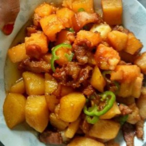 五花肉加生抽后翻炒一会儿后加入切成小块的土豆,再翻炒加盐,(盐要适量了,因为炒肉的时候就已经加过盐了)等土豆也上了色。蓄水