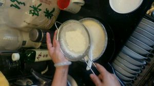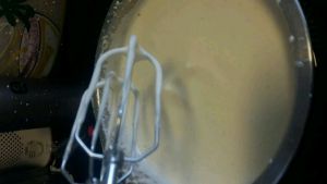 分两三次筛入低粉,用刮刀(我用-的是电饭宝的饭勺,哈哈哈哈 )上下快速翻拌均匀,在倒入盐、油、炼乳混合翻拌均匀。