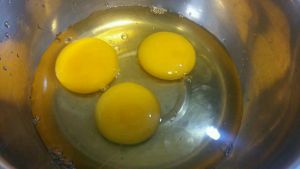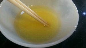 盆里打入鸡蛋,放入全部的白糖,加入一小勺白醋去腥,同时蒸锅开火烧上水。