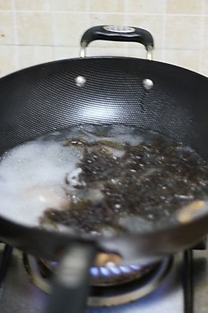 冷水放入干虾,烧至沸腾,再改小火煮五分钟,这样汤里的海鲜味会更浓