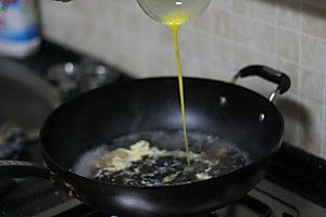 水滚开的时候下入打散的鸡蛋,用锅铲搅动一下,翻出蛋花。