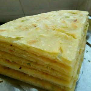从一边卷起成长条状。结成几段再卷成图中一样的卷再擀成薄饼