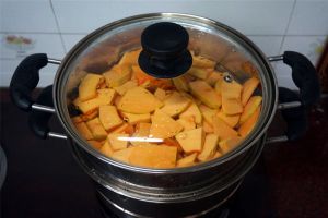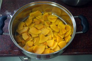 把切好的南瓜片放入蒸笼大火蒸20分钟(冷水入锅)。