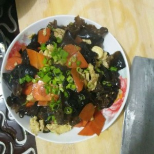木耳炒成8分熟,撒点精盐味精十三香倒入炒熟的鸡蛋,翻炒熟后盛盘撒上葱花