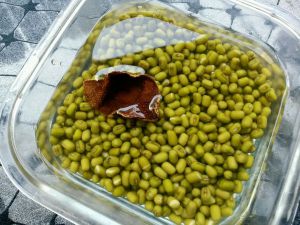 绿豆提前一夜泡,这样容易煲烂,第二天加上陈皮一起泡洗干净
