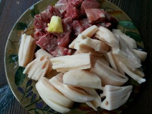 猪骨洗净冷水下锅焯去沫,莲藕切块状