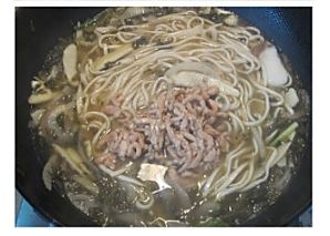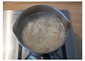 锅中放水烧开后,入面条煮约30秒左右(根据面条粗细而定,粗面需适当延长时间),迅速冷水过滤备用;