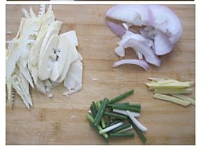 春笋切片,洋葱切丝,姜切丝葱切段,里几肉切成丝;