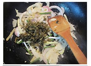 接着放入洋葱丝姜丝雪菜和葱段,一起翻炒1分钟(可加少许水增加食材的湿润度);