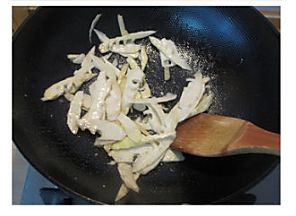 锅中放油烧热后,将腌好的肉丝再倒入少许油抓匀(防止粘锅),放入锅中滑炒,颜色一变马上关火用余温烫熟盛出备用;